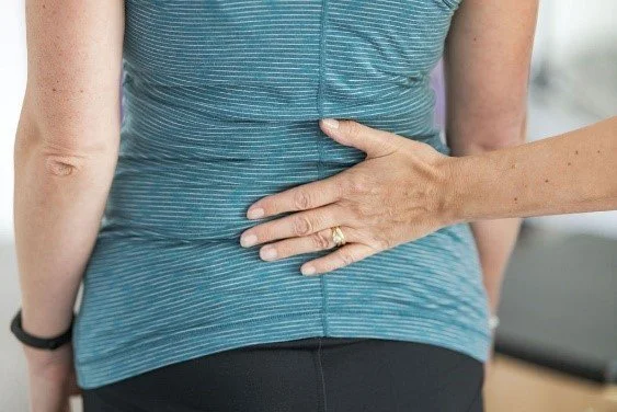 Made of the vertebrae L01-L5, this part of the spine is primarily designed to bear weight. It also primarily moves in the planes of flexion and extension, with some lateral glide, and very little rotation (in the photo, my hand is on the Lumbar region of the client).